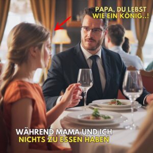Ein armes Mädchen betritt ein Luxusrestaurant in München und sagt zu einem jungen Milliardär: “Papa, du isst wie ein König,” während Mama und…
